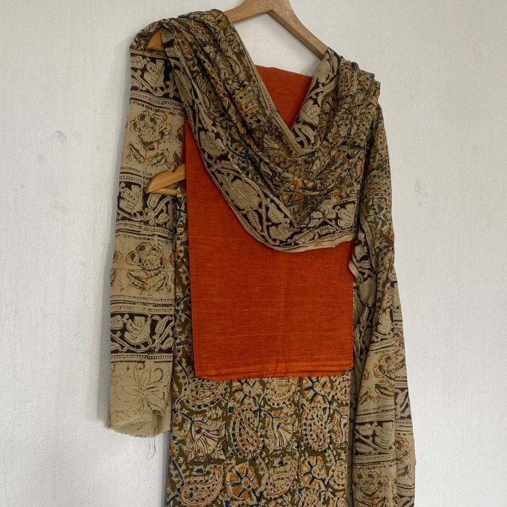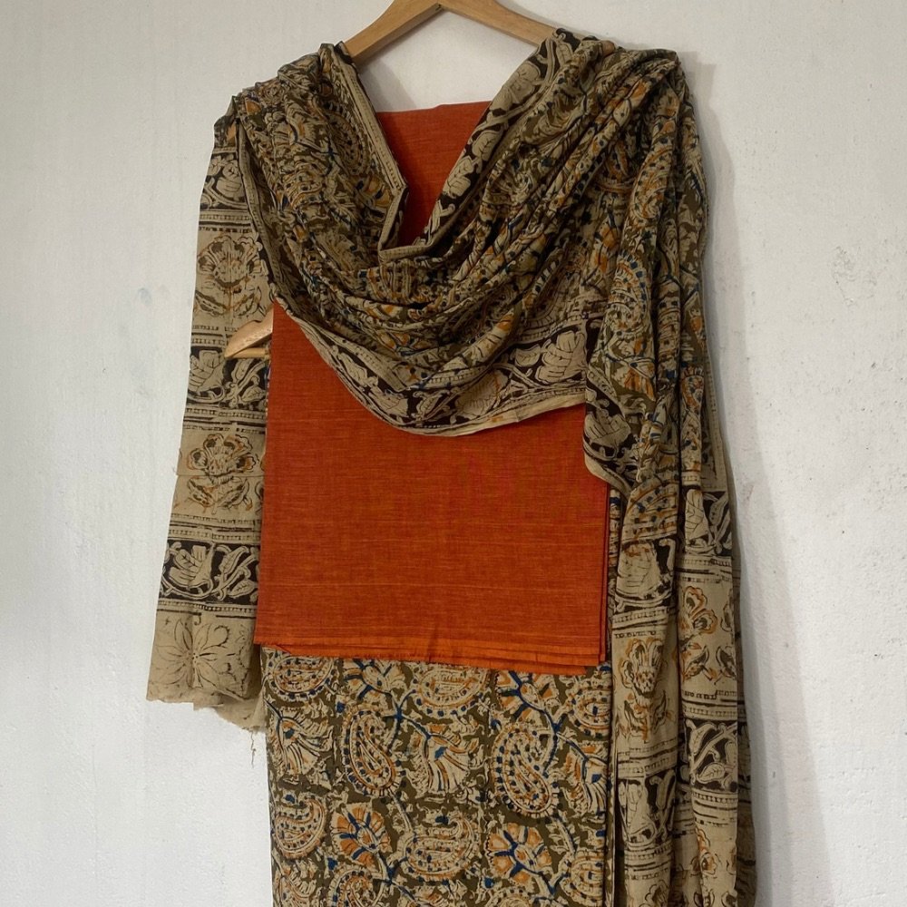 Our handblock printed Kalamkari cotton dress material showcases traditional craftsmanship and natural elegance. Soft, breathable, and eco-friendly Khadi fabric meets intricate handblock prints, creating unique and sustainable clothing perfect for stylish everyday wear or special occasions. Visit our women’s page to have a look at the entire range of women clothing.