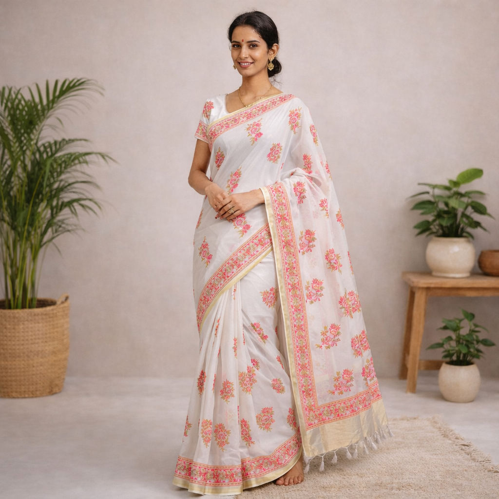 The saree is adorned with artistic floral patterns inspired by traditional prints, adding elegance and grandeur to the design. The soft texture of the fabric ensures a graceful drape, making it comfortable to wear for long hours. Comes with a matching blouse piece, allowing you to customize your look with either traditional or contemporary styles.