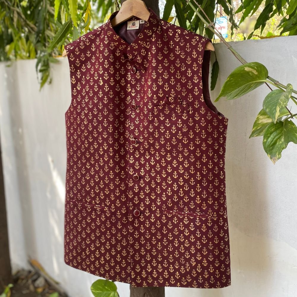 The anchor print Modi jacket is a stylish and unique fusion of traditional Indian wear with a modern twist. This sleeveless jacket features anchor prints, adding a touch of nautical charm to the classic Nehru jacket design, characterized by rows of buttons and distinct Mandarin collars. Made from comfortable fabrics like cotton or blends, it’s perfect for casual gatherings, parties, or events. You can style it over a kurta set or a shirt and pant outfit to infuse an ethnic charm into your look . Visit our men’s page to have a look at the entire range of men’s clothing.