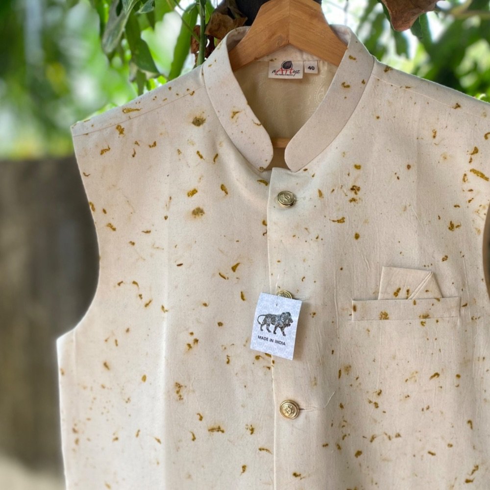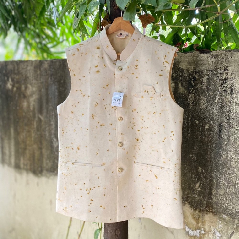 A Modi jacket is a stylish and unique fusion of traditional Indian wear with a modern twist. This sleeveless jacket features ecoprinting using dries marigold flowers, adding a touch of nautical charm to the classic Nehru jacket design, by rows of buttons and distinct Mandarin collars. Made from comfortable fabrics like cotton or blends, it’s perfect for casual gatherings, parties, or events. You can style it over a kurta set or a shirt and pant outfit to infuse an ethnic charm into your look . Visit our men’s page to have a look at the entire range of men’s clothing.