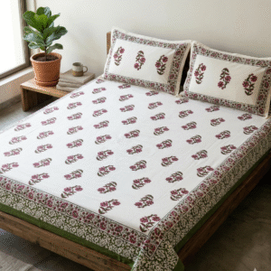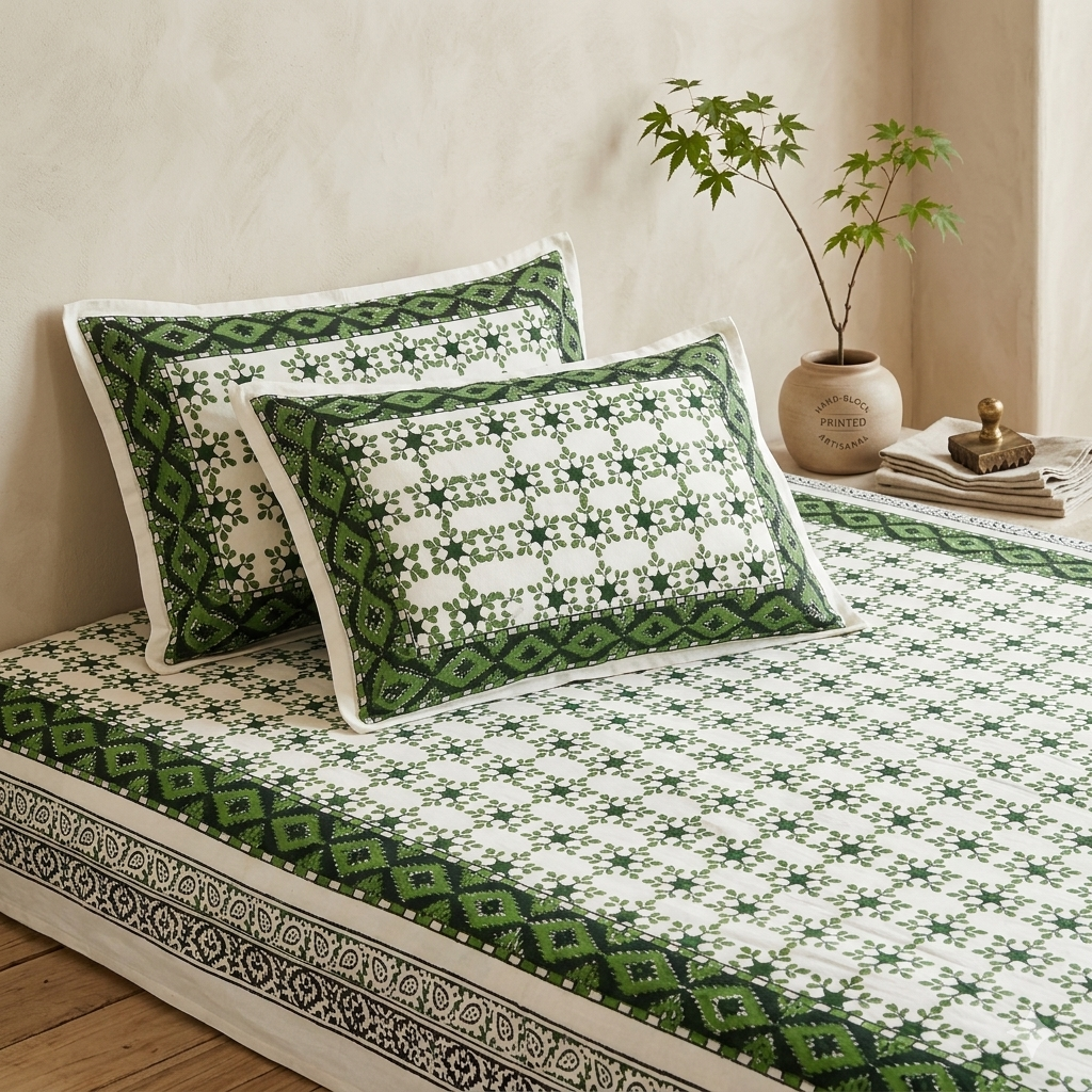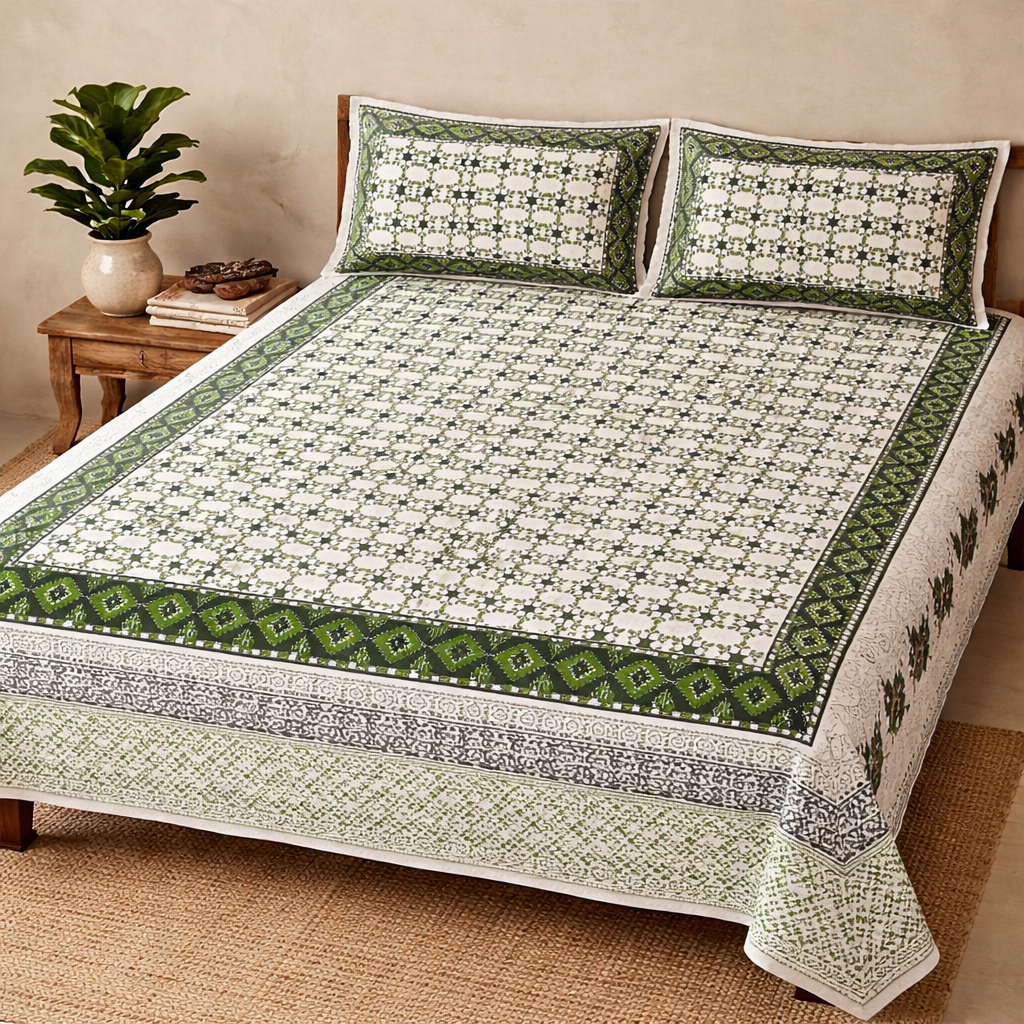 Add harmony to your home decor with this offwhite and green cotton bedsheet by Aartyz. The black and green starred patterns have been hand block printed and add a modern charm to the look.Please visit our Home Decor page for other bedsheets and products.