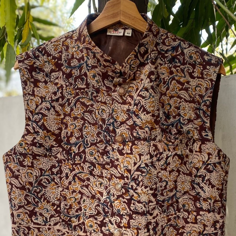A Modi jacket is a stylish and unique fusion of traditional Indian wear with a modern twist. This sleeveless jacket features kalamkari prints, adding a touch of nautical charm to the classic Nehru jacket design, by rows of buttons and distinct Mandarin collars. Made from comfortable fabrics like cotton or blends, it’s perfect for casual gatherings, parties, or events. You can style it over a kurta set or a shirt and pant outfit to infuse an ethnic charm into your look . Visit our men’s page to have a look at the entire range of men’s clothing.